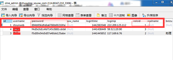 2、雙擊打開sline_admin表,在表中找到字段roleid值為1的數據記錄