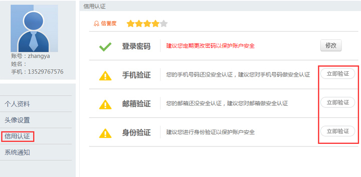 為提高您的信用等級和您賬戶的安全性,請您在登錄系統后,盡快完成信用認證。