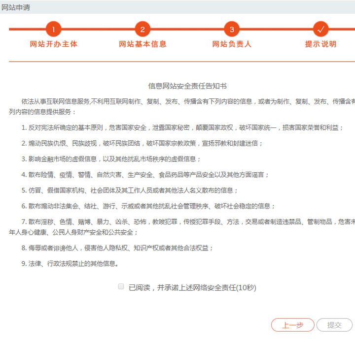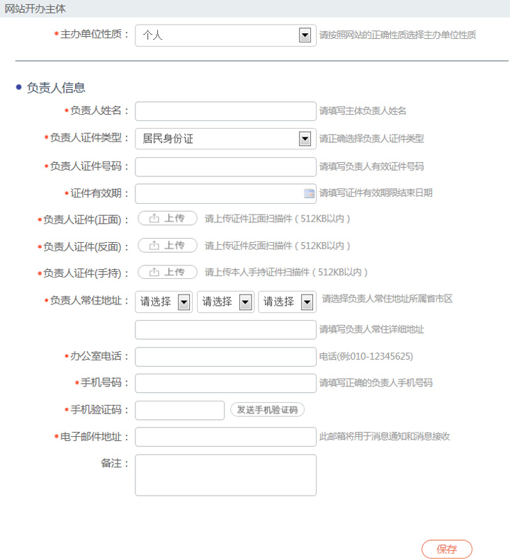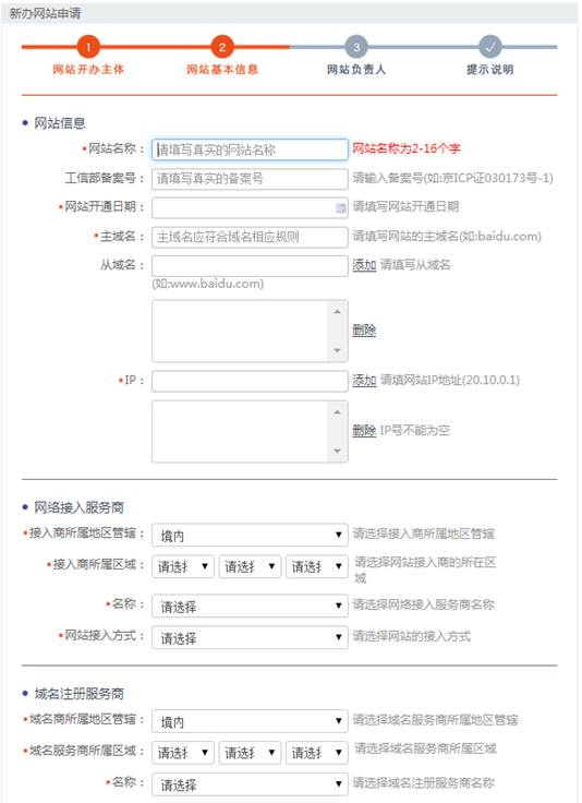 開辦主體申請: 對于首次備案的用戶,必須首先填寫主辦單位及負責人的真實有效信息,只有提交了主體信息后,才能在該主體下進行網站備案。