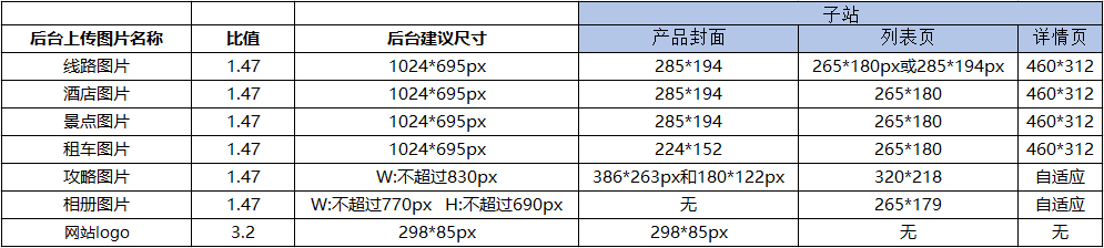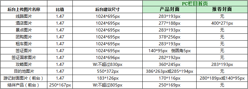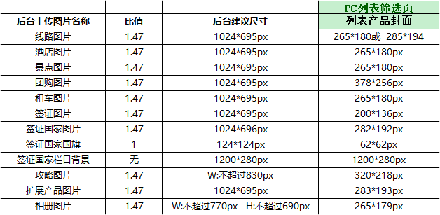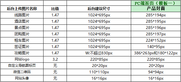 (1)電腦端的圖片上傳建議尺寸與前臺顯示的尺寸列表