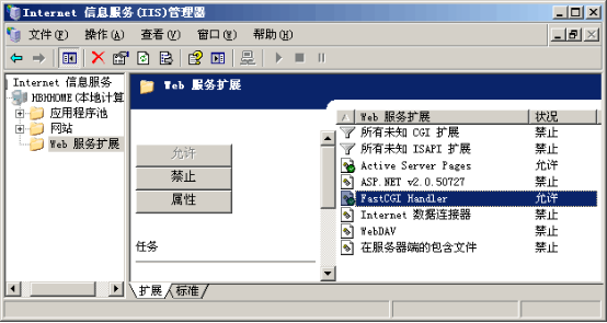 4、 在IIS的“WEB服務擴展”里找到FastCGI Handler