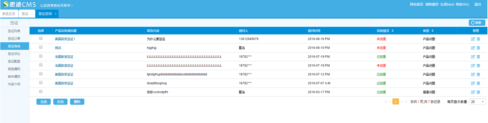 可以針對簽證在前臺產品詳情頁進行咨詢的問題進行回復管理。