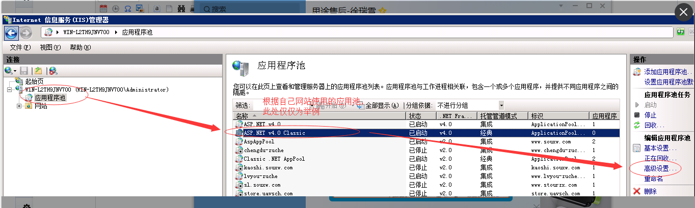 4、 建立網站后,到應用池設定偽靜態支持64位(32位服務器不用設置)