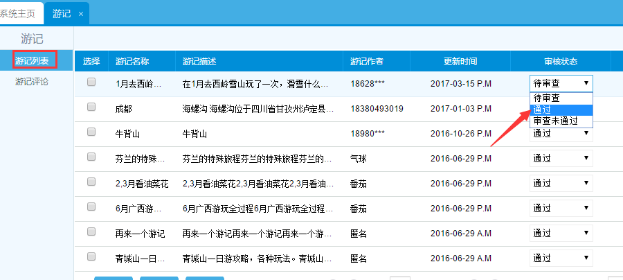 發送成功后,管理員從后臺將游此條游記審核完成后,最新的游記將排在最前面: