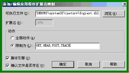然后點(diǎn)擊旁邊的“配置”,查看是否有.php擴(kuò)展名,如果沒(méi)有的話,需要添加一個(gè)新項(xiàng),將可執(zhí)行文件指向“C:WINDOWSsystem32inetsrvfcgiext.dll”,擴(kuò)展名為“.php”(注意有個(gè)點(diǎn)),動(dòng)作限制為“GET,HEAD,POST,TRACE”,點(diǎn)擊確定即可(如圖所示)