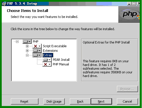 下一步需要配置安裝選項(xiàng),這里我們除了默認(rèn)的選項(xiàng)之外增加了pear install(如圖所示)