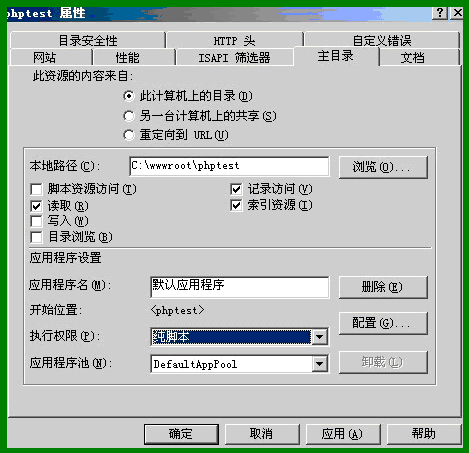 首先打開(kāi)IIS管理器,然后在先前測(cè)試IIS的網(wǎng)站上右鍵,進(jìn)入“屬性”,點(diǎn)擊主目錄選項(xiàng)卡,然后將“執(zhí)行權(quán)限”配置為“純腳本”,(如圖所示)