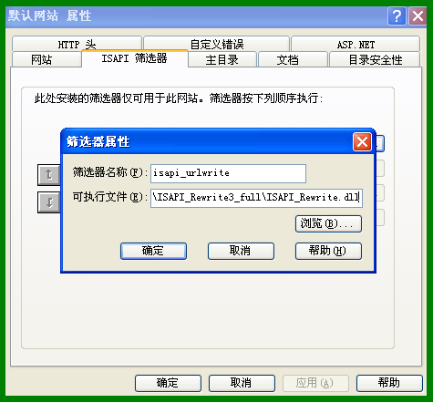 isapi_urlwriter ISAPI擴(kuò)展組件主要用來(lái)做地址重寫,重寫后的虛擬靜態(tài)地址對(duì)搜索引擎更友好。先將ISAPI_Rewrite3安裝包解壓到指定的文件目錄中,然后進(jìn)入網(wǎng)站屬性窗口,選擇窗口中的ISAPI篩選器選項(xiàng)卡,點(diǎn)擊添加按鈕,在彈出的窗口中選擇ISAPI_Rewrite3解壓目錄中的ISAPI_Rewrite.dll文件為可執(zhí)行文件并確定。(如圖所示)
