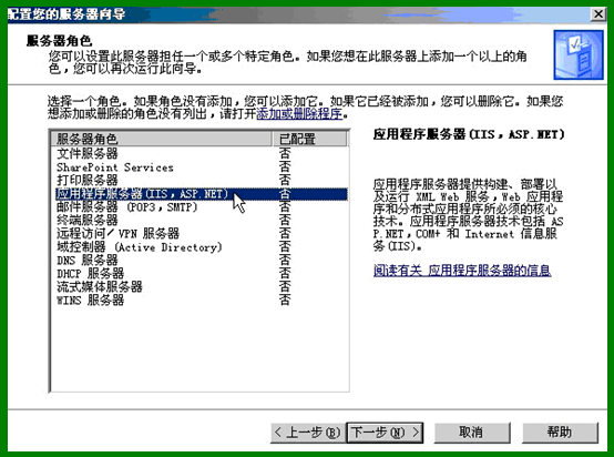 進(jìn)入預(yù)備步驟后直接點(diǎn)下一步。到達(dá)了選擇角色的地方,選擇“應(yīng)用程序服務(wù)(IIS,ASP.net)”(如圖所示)