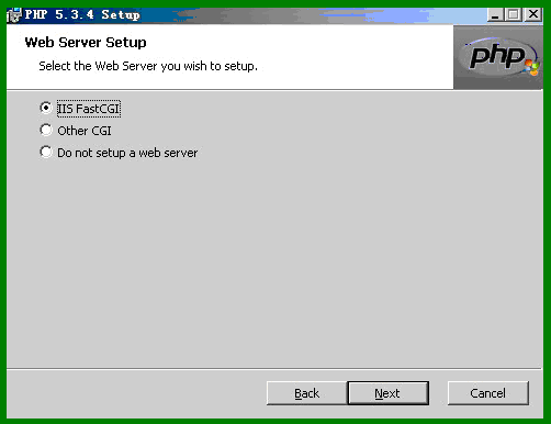首先下載php在windows的安裝包,下載地址http://windows.php.net/downloads/releases/archives/,這里選用php-5.3.4-nts-Win32-VC9-x86.msi做例子。下載好php-5.3.4-nts-Win32-VC9-x86.msi后,雙擊文件安裝,接受使用協(xié)議后,為php填寫安裝目錄,這個(gè)目錄是可以更換的,指向需要放置它的位置即可。之后需要選擇web服務(wù)器的安裝,這里選擇我們先前安裝的IIS fastcgi(如圖所示)
