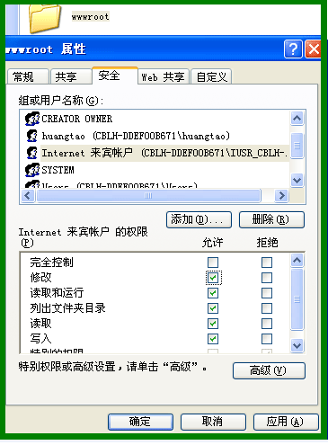網(wǎng)站的匿名訪問(wèn)賬戶是:IUSR_CBLH-DDEF00B671,為文件夾設(shè)置用戶訪問(wèn)權(quán)限(如圖所示)