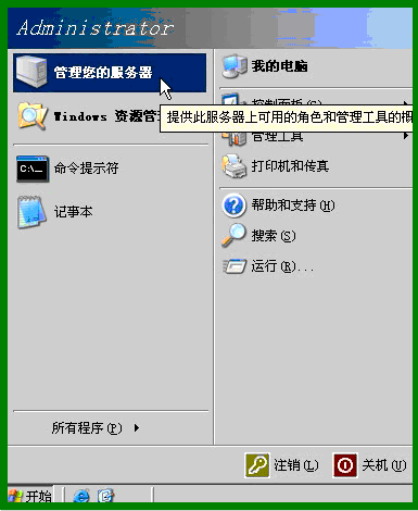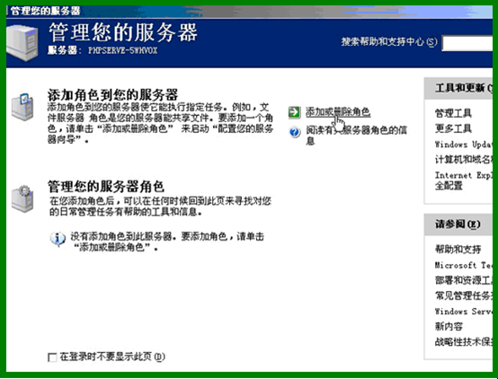打開(kāi)“開(kāi)始”菜單,點(diǎn)擊“管理您的服務(wù)器”(如圖所示),點(diǎn)擊“添加或刪除角色”(如圖所示)。