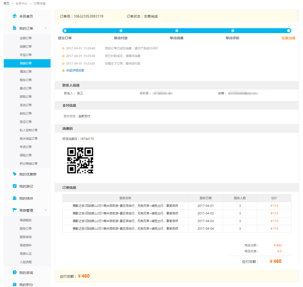 游客下單后,訂單中會有二維碼: