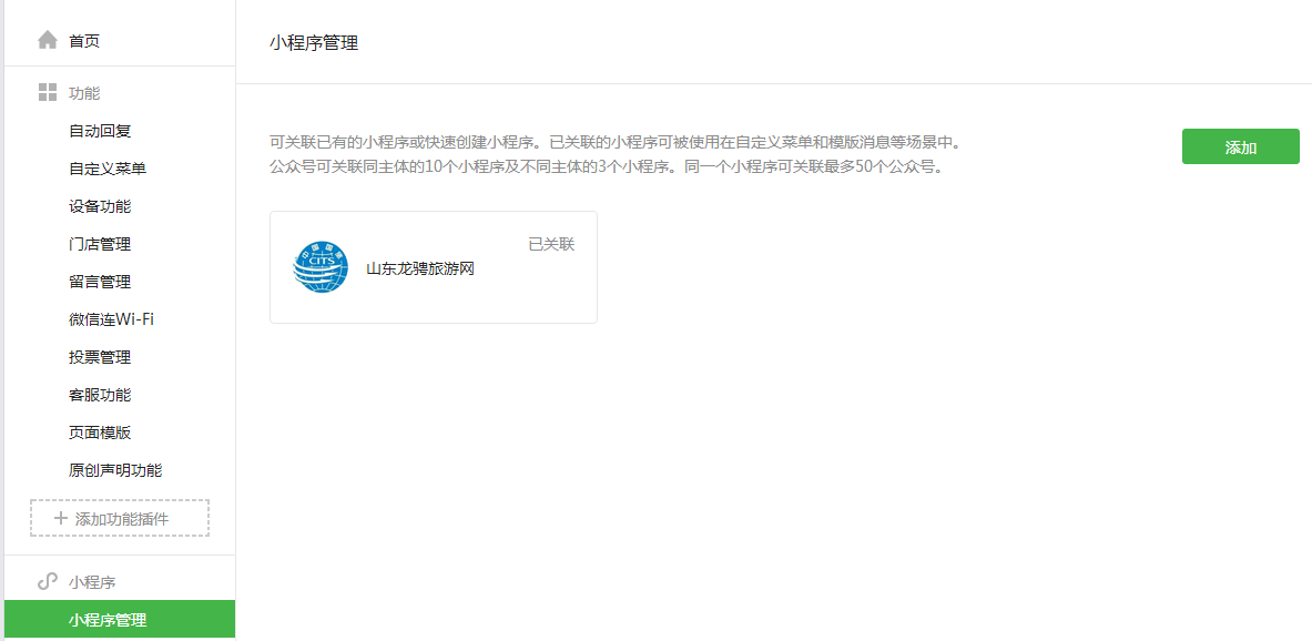 下圖是通過快速創建小程序后,公眾號平臺的展示效果,可以看到已經顯示關聯上該小程序: