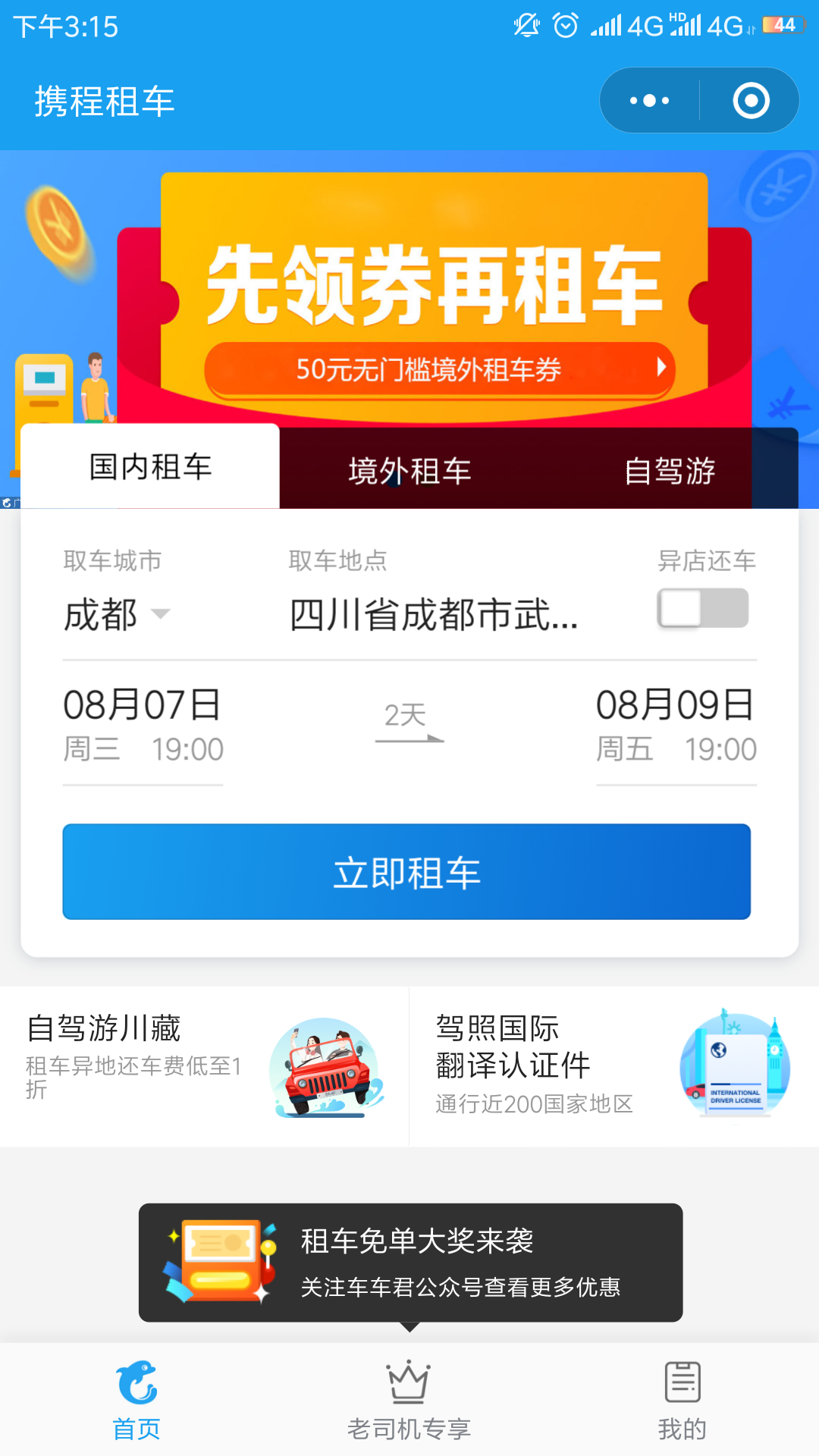 該模板把優惠券放在了banner圖吸引游客,導航欄包含國內租車、境外租車、自駕游模塊。在租車模塊的下面通過選擇取車城市、地點、是否異店還車、還車時間,就可以直接租車;下方還顯示著自駕游川藏和駕照國際翻譯認證件,為游客提供了極大的便利。同時,在老司機專享頁面,采用了于公眾號關聯的措施,提高游客的留存率。