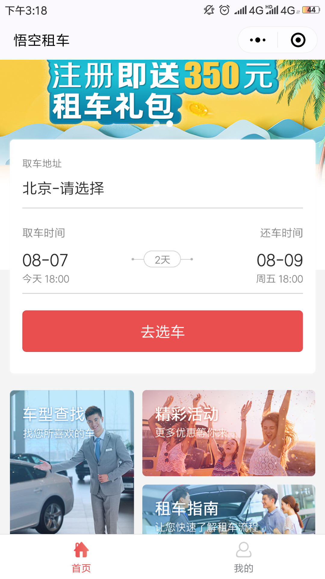 該模板重點突出了該小程序的租車業務,在首頁向訪問者推薦APP下載、以及小程序專享租車劵。在國內租功能板塊下,游客可以自主選擇取車還車門店,確定后可根據該地目前現有的車型進行選擇。