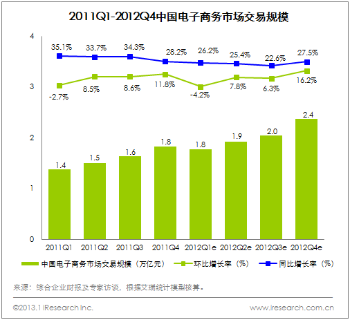 艾瑞咨詢統計數據顯示,2012年中國電子商務市場整體交易規模為8.1萬億元,增長27.9%,與2011年32.8%的增速相比,下降了近5個百分點;其中2012Q4整體交易規模為2.4萬億元,環比增長16.2%,同比增長27.5%。