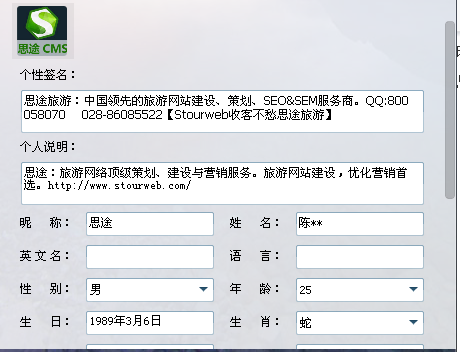 這是QQ最常見的基礎資料卡,旅游網站要盡可能完善自己的資料,建立給人信賴的印象,思途建議您的昵稱使用真名或者旅行社的名稱,頭像可以使用旅游網站的統一的logo,不要使用花哨的圖片和火星文當做昵稱,會給人一種不成熟、非主流的印象。