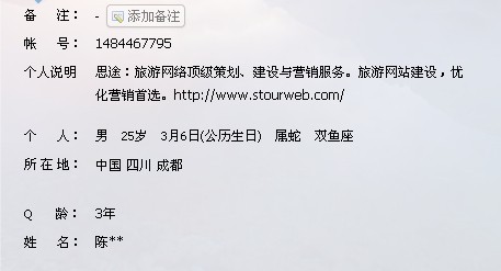 在上圖的QQ資料卡中還有一項便是QQ簽名,QQ簽名字數的上限是50個字,所以在編寫QQ簽名的時候應該注意字數的控制。客戶加進您的QQ最先看到您的昵稱,之后便是看到你的個性簽名,所以個性簽名也是相當重要的。企業常常會使用“旅游產品+價格+聯系方式”這種組合構成QQ簽名。無疑這樣的個性簽名是沒有任何的吸引力的。旅游網站要盡量地避免這種類型的個性簽名。