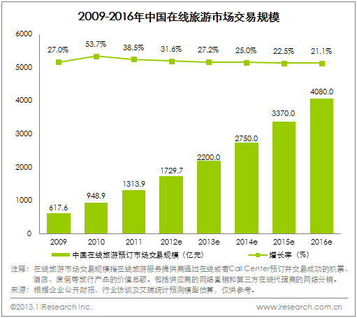 艾瑞咨詢:2012年中國在線旅游市場交易規模達1729.7億