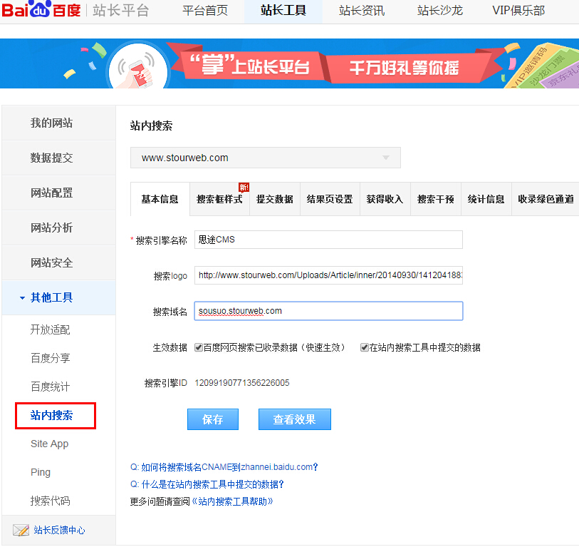 使用搜索引擎的站內(nèi)搜索代碼,在一定程度上都可以享受到該搜索引擎對與認(rèn)證站點抓取速度加快、增加收錄量的作用。以百度站長平臺提供的站內(nèi)搜索為例,我們做以下分析。