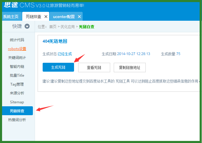 思途CMS根據網頁地址規則,通過面頁中存在的地址與地址規則進行對比,快速找出死鏈接,生成死鏈接地址庫,站長可以準確的找到這些地址刪除,或者死鏈接地址提交給搜索引擎,禁止抓取這些地址。這是網站管理中非常重要的操作,對于優化排名,有明顯促進作用。