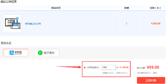 A.先在“使用思途積分”前打勾,然后輸入積分。“移動端LBS”應用正常售價為:298元,活動期間最高可抵199元=1990積分!輸入積分1990個,支付99元即可活動“移動端LBS”應用!