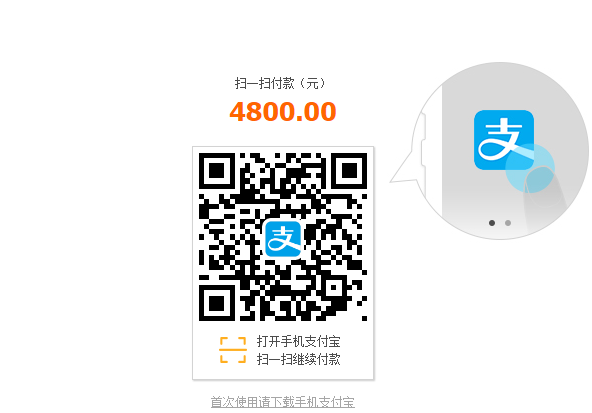 在“優惠方式”下方“可用抵用券”下有剛剛通過“積分活動”兌換的“400元抵用券”,在該抵用券前面點擊選項框即,“支付金額”將自動抵消400元,在點擊“立即支付”按鈕得到以下界面:
