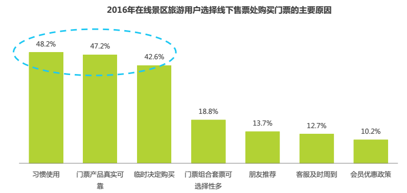 在售票處購買景區(qū)門票是最傳統(tǒng)的方式,用戶購買主要是因為習慣使用,占比達到48.2%;其次實體門票的糾紛問題相對較少,直接買票入園更加可靠(47.2%);另外在“說走就走”的旅行中,臨時決定購買(42.6%)也是主要原因。