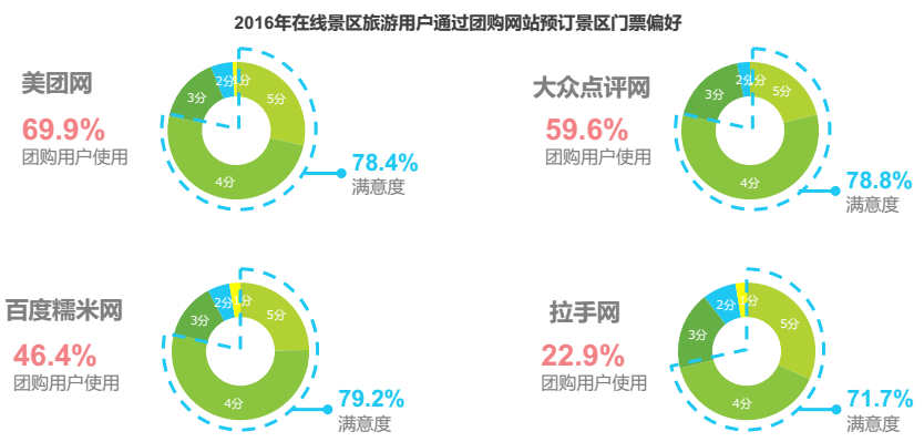 69.9%的團購用戶使用過美團網(wǎng)預訂景區(qū)門票,大眾點評以59.6%的使用率位居第二位,由此可見新美大在團購市場的品牌影響力非常巨大。從餐飲、演出逐漸跨界到景區(qū)門票產(chǎn)品,新美大將客源流量優(yōu)勢覆蓋到旅游目的地。從滿意度來看,四大團購網(wǎng)站的高分值綜合比例都超過了70%,用戶對團購產(chǎn)品的認可度較高。