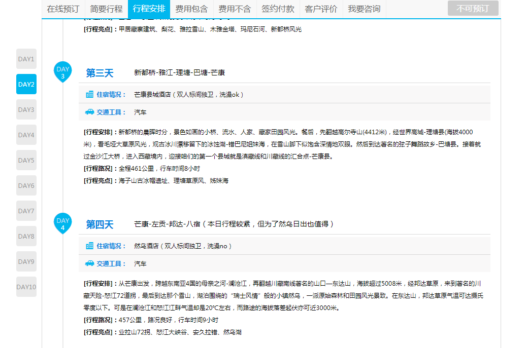 行程安排是對某條旅游產品的具體介紹,它直接決定了這條線路能不能吸引到游客。首先,行程介紹應該具體,不應該太簡略,像是一句話這種方式。第二,行程安排不能直接把某個景點介紹直接復制過來,游客實際需要的并不是這些景點的官方資料,他們想看的是這個景點為什么值得去?有什么亮點?與其息息相關的實用型內容才是他們最關注的。文字也不能過多,因為用戶耐心有限,不可能在某條線路上停留太長時間,而且重點部分應該予以標識,否則游客看了整條線路,一點重點也沒有。第三,很多旅游線路天數都比較長,用戶看下面時,有時候想回到某一天看看那一天的安排,需要自己滑動鼠標慢慢往回翻,非常麻煩,而如果左側有一個浮動天數標簽的話,則可以很好的解決這個問題,方便用戶,如下圖所示: