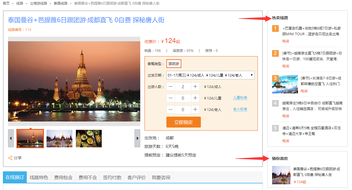 這是一個對旅行社來說更加實(shí)用的場景。舉個栗子,你可以在線路欄目內(nèi)添加一個目的地相關(guān)的酒店、景點(diǎn)、文章模塊。這樣,用戶在瀏覽三亞線路產(chǎn)品時,右側(cè)就會向用戶推薦三亞附近的酒店、好玩的地方或者三亞的旅游攻略;用戶瀏覽成都的線路,系統(tǒng)就會向用戶推薦成都的酒店、景點(diǎn)。用戶很有可能在預(yù)訂了線路產(chǎn)品的時候又順便定了個推薦的酒店。