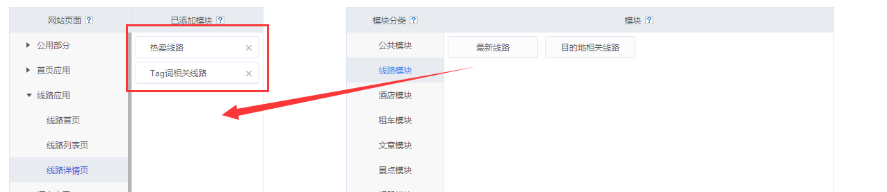 在右側(cè)選擇需要添加到線路詳情頁的模塊,如熱賣線路,Tag詞相關(guān)線路。
