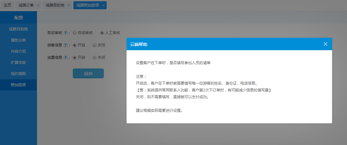 登錄后臺系統 > 產品類 - 直接營銷 > 線路 > 配置 > 附加規則,開啟游客信息功能
