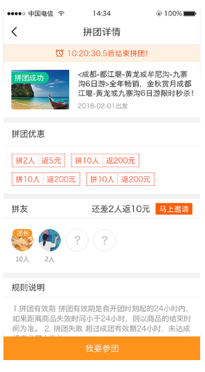 試想,如果有一個熱愛旅游的張阿姨,每年都要休假去看大好河山。這次,她在瀏覽九寨溝線路產(chǎn)品時,看到了參與拼團旅游,就能拿到5元,甚至200元的返現(xiàn)時,會不會心動?而且返現(xiàn)不只自己能拿,參與拼團的好友也可享受,那張阿姨會不會也將產(chǎn)品鏈接分享到自己的微信上,鼓勵姐妹們一起加入呢?而且,如果已有的團都滿了,阿姨還可以發(fā)起一個新團。一鍵分享的事,怎么樣自己都不算虧。張阿姨們的心里或許都打著這樣的算盤。