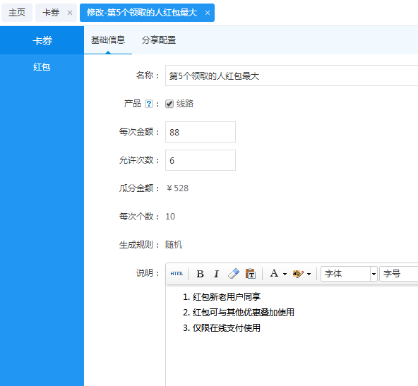 提醒大家,拼紅包應用的入口在輔助營銷欄的“卡券”類哦!