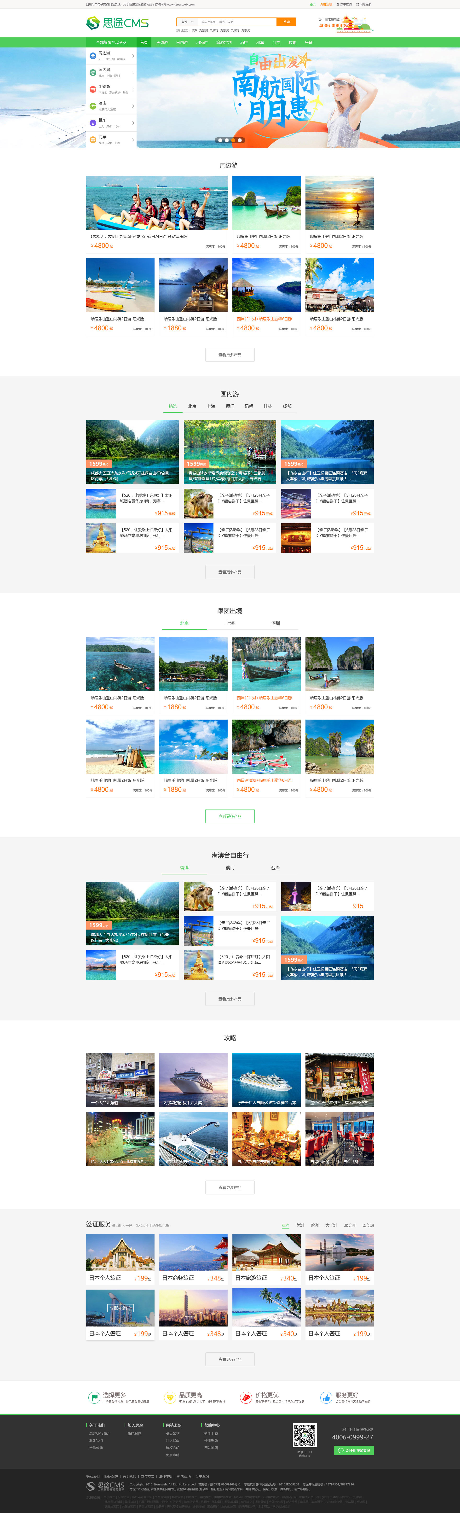 該套旅游線路首頁模板美觀精致。時尚是當今旅游網(wǎng)站模板設計不可或缺的元素,而這套模板恰恰代表了時尚設計的前沿,符合了游客對于時尚旅游的追求,極具感觀沖擊。網(wǎng)站頁面的主題非常明確,線路以圖片呈現(xiàn)為主,配以少量的文案描述。對游客而言,更容易吸引他們的目光,提高了游客的購買率。以時尚為主題,以游客體驗為出發(fā)點,對于以線路跟團游為主的旅游服務商而言。這絕對是一套不容錯過的旅游時尚線路首頁模板。