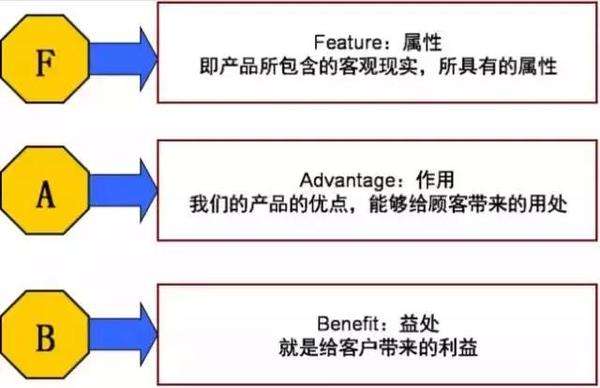 FAB法則是說服性演講的結構,它達到的效果就是讓客戶相信你的是最好的,從屬性,作用,益處三方面來講。這里值得注意的地方就是切忌把屬性當成特征來講,特征是與對手直接比較,會令用戶反感。而屬性就是講客觀事實,更讓人信服。