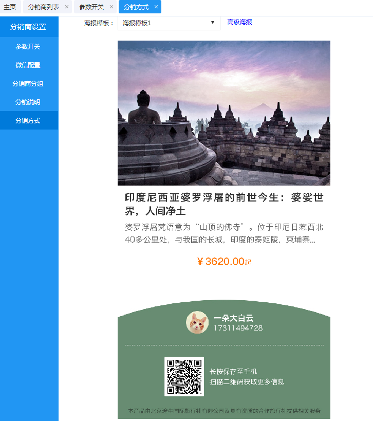 另外,對于有美工,制圖能力的用戶呢,思途也特別增加了高級海報插件。也就是說,商家可以根據(jù)自身的產(chǎn)品情況,針對不同的產(chǎn)品量身設(shè)計背景圖片上傳至后臺,而后臺則會為海報自動匹配產(chǎn)品二維碼。由此分享出去的海報,則能夠更直觀的傳遞旅行社自身的設(shè)計理念,滿足我們個性表達的需求。
