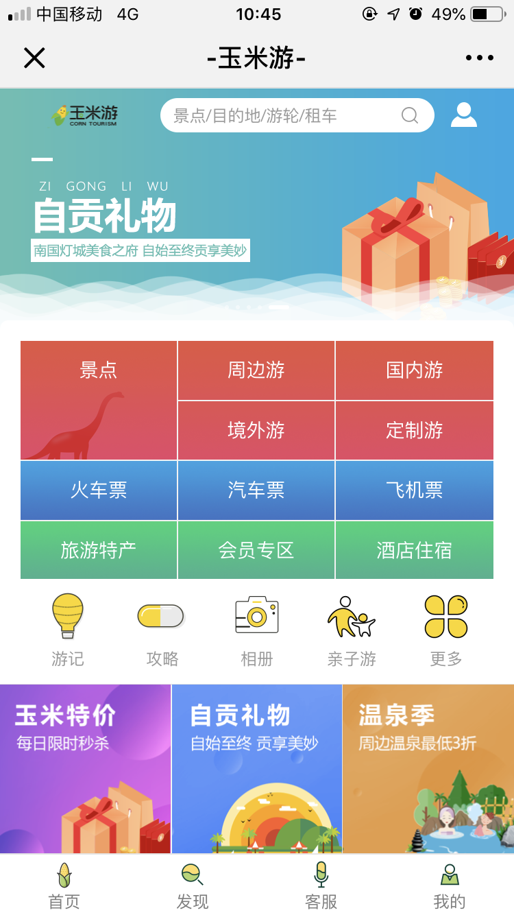 除此之外,玉米游還當天發布并上線了鹽文之旅、鹽樂之旅、鹽佛之旅、鹽龍之旅四條旅游新線路以及自駕游套票,進一步豐富了自貢旅游線路。