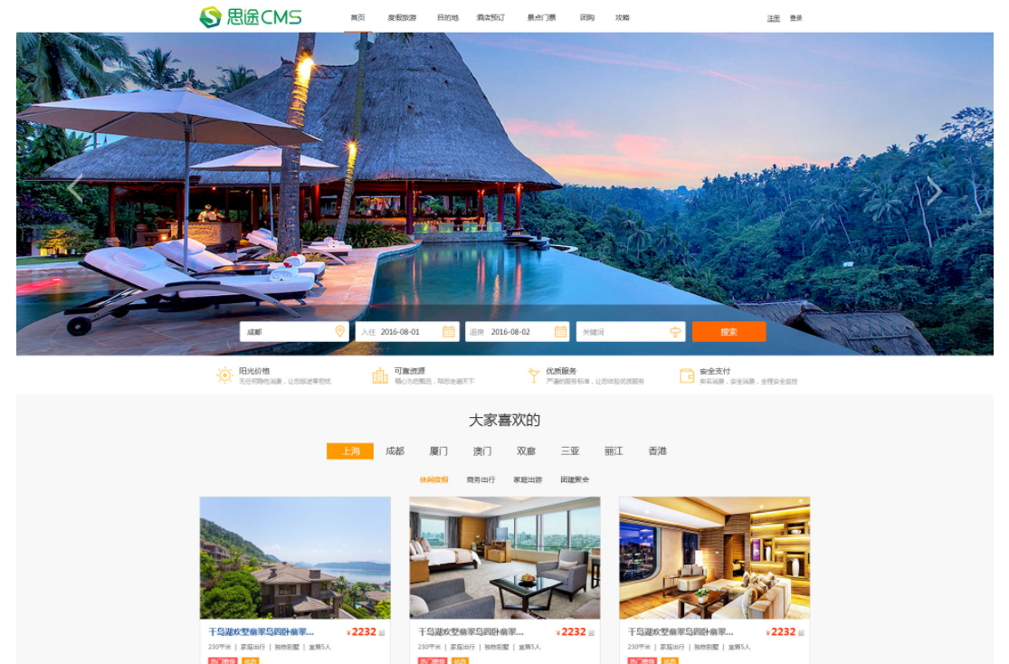 還有一些朋友的網(wǎng)站可能是專注于某一類型的產(chǎn)品,比如是專做酒店產(chǎn)品的電商平臺,那這個時候,我們可能就會考慮網(wǎng)站的專業(yè)性。在沒有額外預算做定制開發(fā)的情況下,我們就可以考慮精準的類型模板。以酒店網(wǎng)站為例,我們的站長朋友就可以選擇思途仿途家酒店首頁模板。這套模板就是專為酒店平臺量身打造,一切導向都以酒店業(yè)務為基準。游客進入我們的網(wǎng)站后,就可以快速地篩選查找和預訂酒店產(chǎn)品了。 此外,本套模板也配備了攻略和游記等引導模塊,也利于站長在網(wǎng)站進行軟文推廣哦。