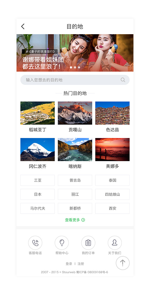 怎么辦呢?上周思途新上線的移動端免費目的地欄目首頁模板,配置了專門的目的地搜索功能,游客可以快速搜索搜索相關目的地,同時平臺還可以利用熱門目的地推薦,增加目的地產品的曝光機會,輕松助力目的地相關產品營銷。