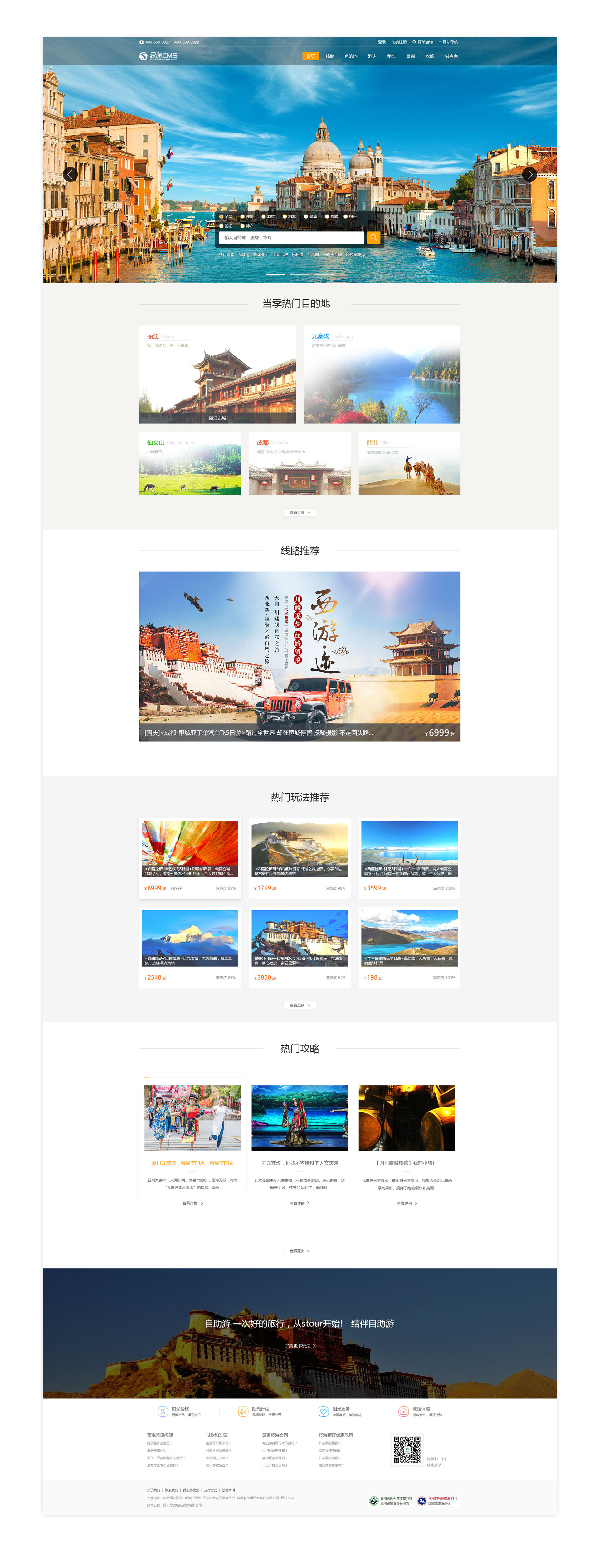 (網站首頁)該模板適合以自助游,自由行為主的旅游網站使用。網站結構簡潔清晰,首屏即以整屏超大banner圖片突出網站特點,增強視覺效果。首頁陳列熱門目的地,精選線路產品和熱門玩法等推薦產品,通過視覺圖片和文字,讓自助游游客產生強烈的興趣。首頁輔以游記攻略板塊,吸引游客深入訪問,增加網站的停留時間和轉化率。*該模板不支持換膚,不支持二級導航。