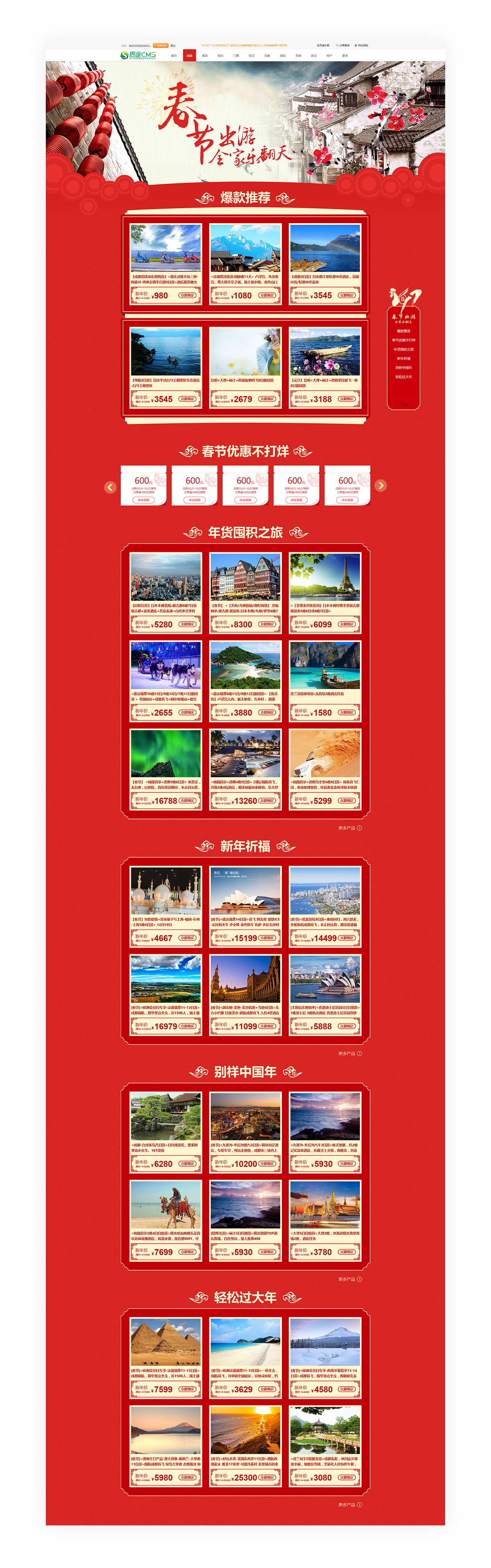 (專題頁)此模板以春節(jié)為主題,頁面具有強烈的節(jié)日氛圍和濃厚的傳統(tǒng)文化元素,如祥云,金雞,窗雕等,為游客營造出喜慶,熱鬧的春節(jié)氣息。此套春節(jié)模板以線路為主題,活動頁面可以展示豐富的旅游線路,配合網(wǎng)站營銷活動,具有較強的視覺沖擊力和產(chǎn)品吸引力。春節(jié)模板能為旅游網(wǎng)站提供良好的營銷效果,因其時效性較強,建議旅游網(wǎng)站提前購買,做好春節(jié)活動準(zhǔn)備。*使用此模板需提前安裝全新專題應(yīng)用(No.67)該模板不支持換膚。